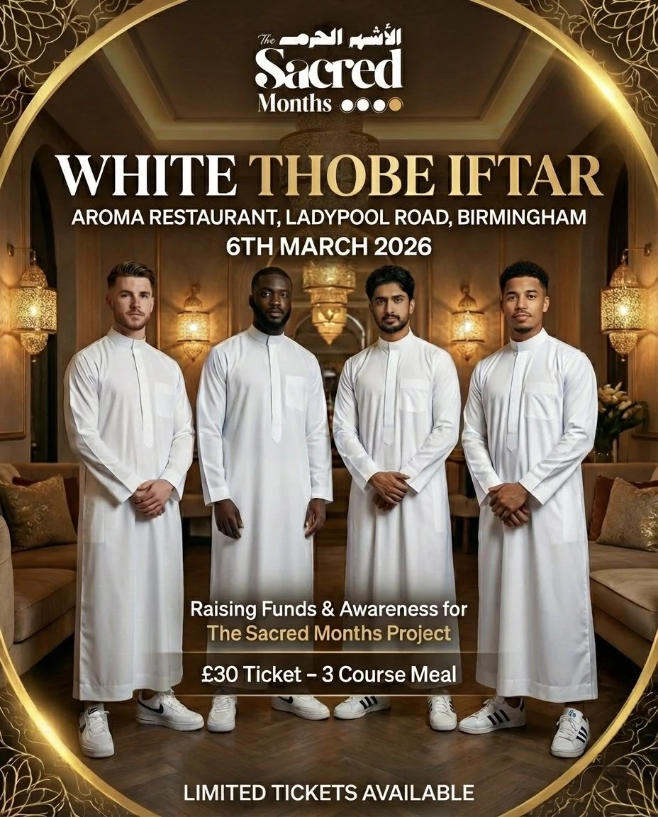 Join us for an exclusive evening of brotherhood, great food, and giving back at the White Thobe Iftar. Hosted at Aroma Restaurant on Ladypool Road on March 6th, 2026, this special gathering is dedicated to raising vital funds and awareness for The Sacred Months Project. Your £30 ticket includes a delicious 3-course meal in a welcoming, modern atmosphere. The dress code is clean and contemporary: bring your crispest white thobe and pair it with your favorite sneakers. We have a very limited number of seats available, so secure your ticket today to be part of a meaningful night that blends faith, style, and community.